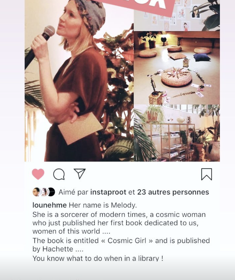 “Numéro 1 des livres qui font du bien… en ce moment je lis Cosmic Girl de Mélody Szymczak qui est pour faire court, une sorte de guide pour les femmes (et les hommes) qui ont besoin de reconnecter avec leur voix intérieure. Vous avez cette petite voix qui vous conseille en chuchotant de suivre votre INSTINCT… la couverture est envoûtante et l’intérieur captivant qu’on adore lire dans un hamac en sirotant un thé glacé !”